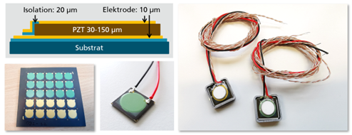 Mit Messverfahren auf der Basis von Ultraschall lassen sich festkörper- und fluidmechanische Größen, Werkstoffeigenschaften sowie Bauelemente- und Systemzustände bestimmen. Piezokeramische Ultraschallsender und -empfänger sind Stand der Technik. Ihr Aufbau erfordert zahlreiche Komponenten unterschiedlicher Werkstoffe und viele Montageschritte. Ihre siebdrucktechnische Herstellung verspricht dagegen Miniaturisierung, höhere Zuverlässigkeit, Kostensenkung und ermöglicht höhere Ultraschallfrequenzen als bisherige Technologien. Es wurden strukturierte piezokeramische Dickschichten auf eigens entwickelten, additiv gefertigten keramischen Substraten mit spezifischen akustischen Dämpfungseigenschaften realisiert. Damit lassen sich beispielsweise vollkeramische Ultraschallwandler für Hochtemperaturanwendungen realisieren. Die Technologie steht für den Transfer in industrielle Anwendungen bereit.