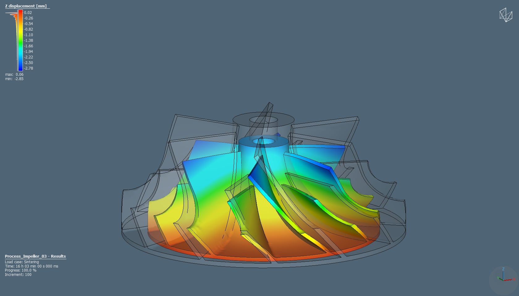 Insbesondere im Sinterschritt treten im Bauteil starke Schwindung und Verzug auf. Durch Simulation kann diese Verformung berechnet und kompensiert werden. Die Fähigkeiten dazu und eine zeiteffiziente Kalibriermethode für die verwendeten Werkstoffe wurde im Rahmen von SEBIS-JET weiterentwickelt. Dadurch können Design- und Prozessentwicklungszyklen verkürzt werden.