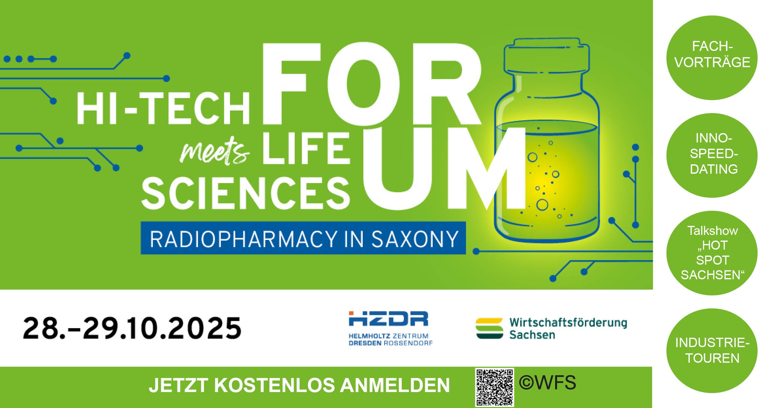 Vom 28. Oktober bis 29. Oktober 2025 fand in Dresden das Hi-Tech meets Life Science Forum statt. Unter dem Motto „Wertschöpfung erweitern – Radiopharmazie-Ökosystem in Sachsen stärken“ wurden in drei thematisch fokussierten Sessions zentrale Entwicklungsschritte behandelt: Neue Radionuklide, Radiopharma-Produktion und klinische Anwendung. Die Veranstaltung brachte Wissenschaftler, Industrievertreter und Kliniken entlang der radiopharmazeutischen Wertschöpfungskette zusammen, um das Thema in Sachsen weiter zu positionieren.