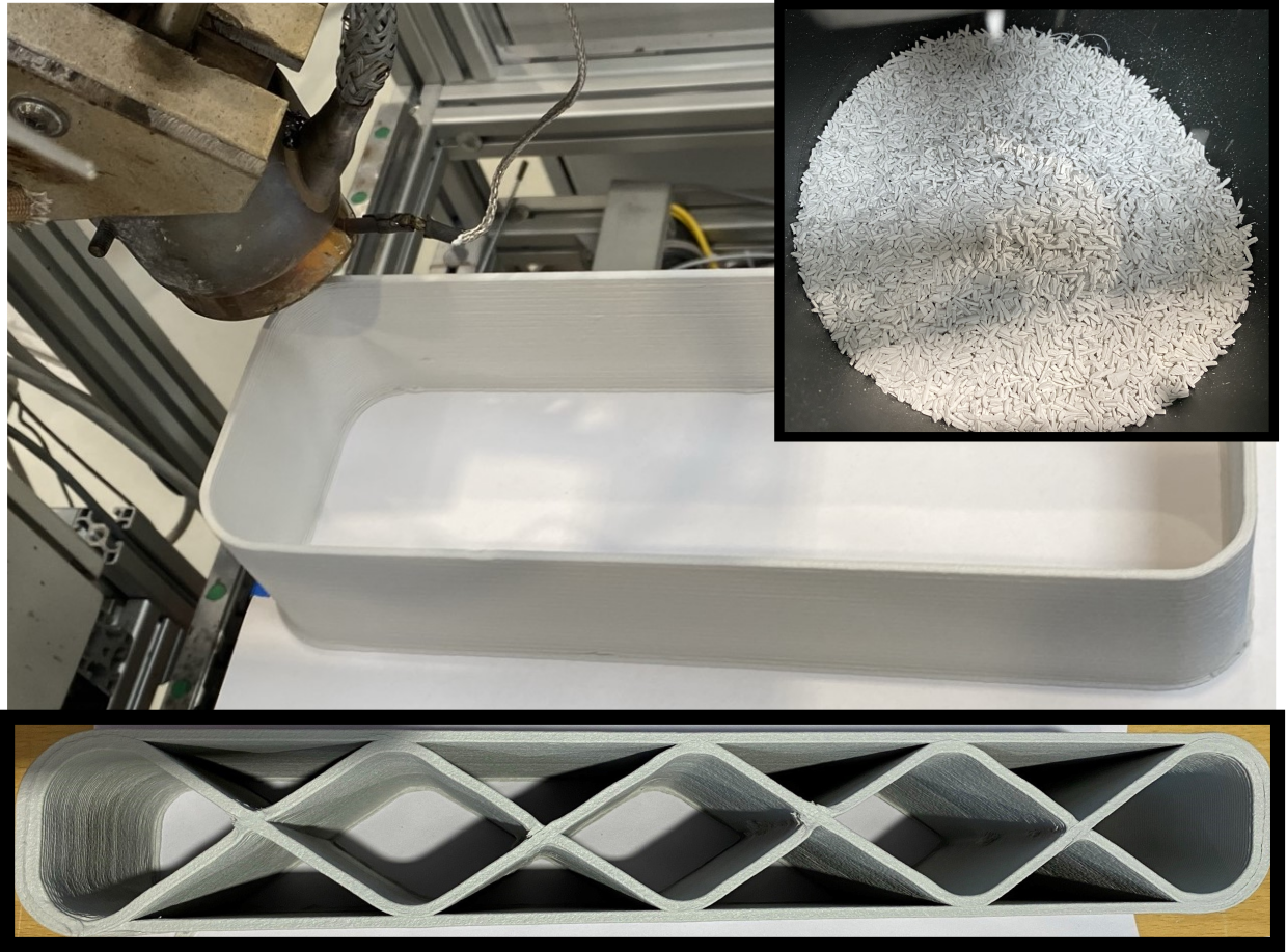 Die entscheidenden Vorteile der großformatigen additiven Fertigung bestehen in der schnellen, individuellen und ressourceneffizienten Bauteilherstellung ohne aufwendigen Werkzeug- und Vorrichtungseinsatz. Für eine schnelle und kosteneffiziente additive Fertigung von Kunststoffbauteilen hat sich die Schneckenextrusionstechnik (SEAM) bewährt. Dabei werden handelsübliche Kunststoffgranulate mit einem Schneckenextruder plastifiziert, über eine Düse schmelzflüssig ausgetragen und schichtweise bis zur Bauteilendkontur präzise abgelegt.