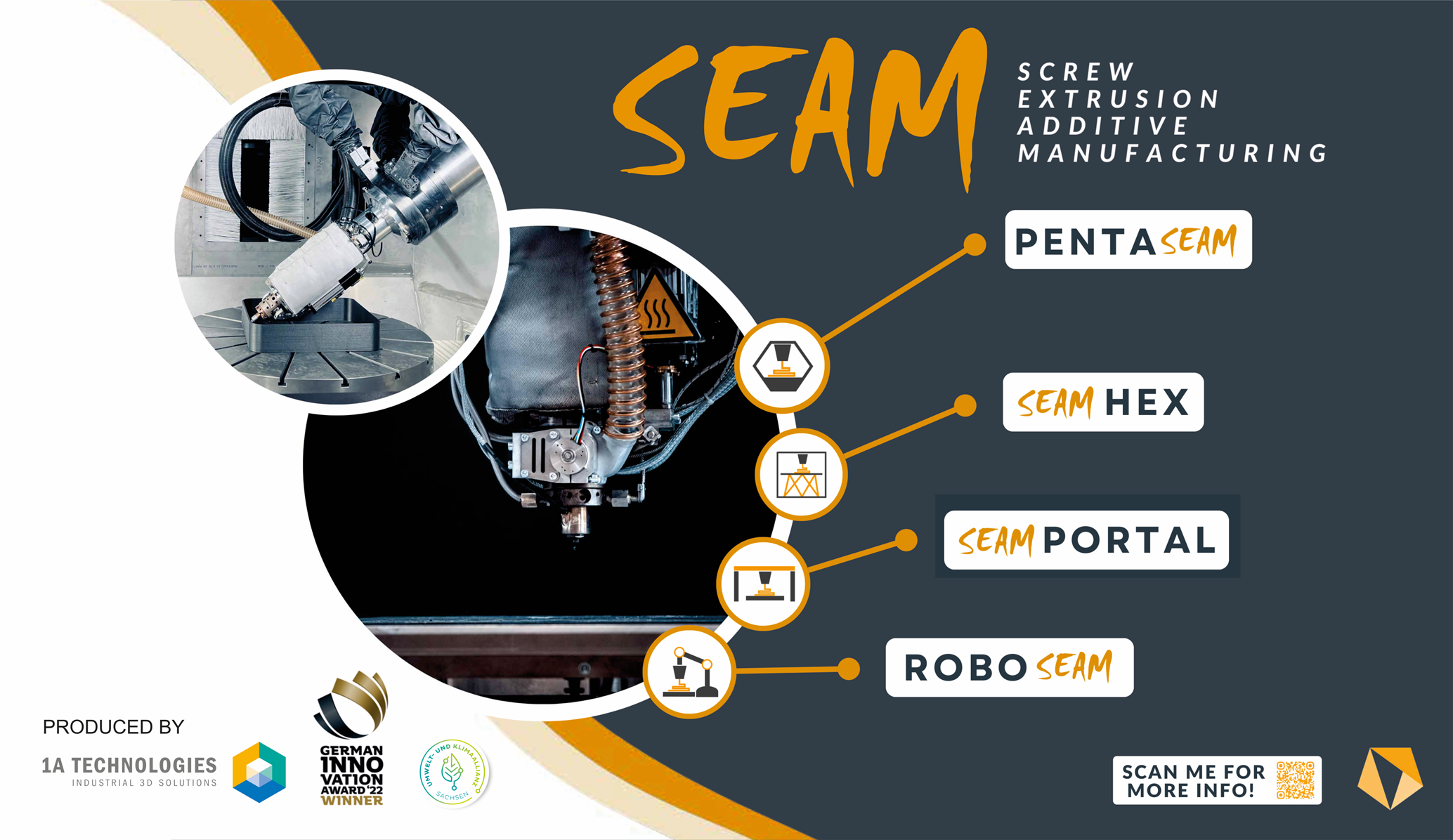 Für die additive Fertigung großvolumiger und belastbarer Kunststoffbauteile entwickelte das Team vom Fraunhofer IWU eine sogenannte SEAM (Screw Extrusion Additive Manufacturing) Extrusionseinheit mit eingebauter Druckregelung und Volumenstromkontrolle. Diese ist patentiert (DE102018216149A1 / DE 10 2018 216 152 A1) und ist seit April 2020 von der Fa. 1A-Technologies UG als Fraunhofer Ausgründung unter dem Geschäftsführer Marcus Witt industriell verfügbar gemacht worden.