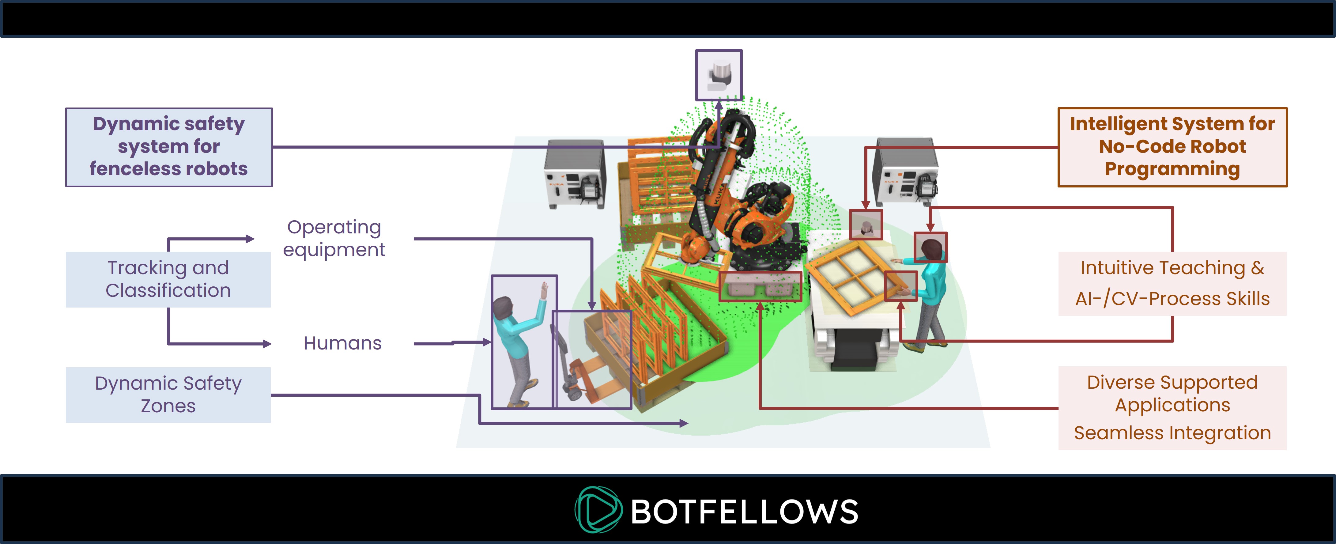 Botfellows ist Anbieter hochmoderner Robotik- und Automationslösungen für produzierende Unternehmen, Robotik OEMs und Systemintegratoren. Mit modernster Technologie ermöglicht Botfellows nahtlose Mensch-Roboter-Teamarbeit in agilen Produktionsumgebungen. Unsere modularen Lösungen sind so konzipiert, dass sie den dynamischen Anforderungen der heutigen Industrie gerecht werden und unvergleichliche Flexibilität und Effizienz bieten. Die Botfellows GmbH ist spezialisiert auf intelligente Sicherheitstechnologie für nahtlose Mensch-Roboter-Zusammenarbeit, Umgebungswahrnehmung und KI für agile Produktionsumgebungen und intelligente Bildverarbeitungstechnologie für No-Code-Roboterautomatisierung.