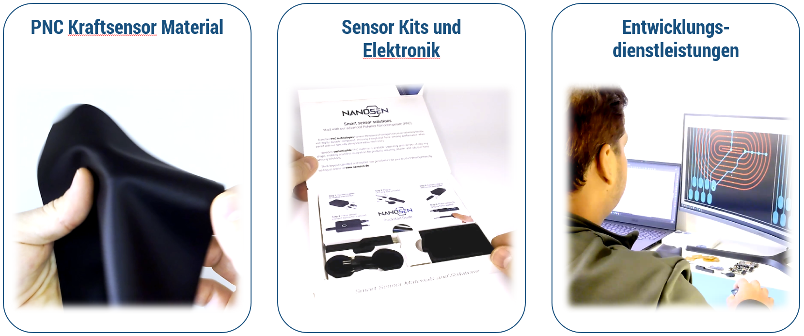 Die NanoSen GmbH spezialisiert sich auf die Entwicklung hochsensibler, robuster Kraftsensoren. Mit einem innovativen Polymer-Nanokomposit (PNC) stellt das Unternehmen dünne, flexible Sensoren her, die z. B. Kräfte von 0,01 N bis 200 N bei einem 20-mm-Sensor messen können. NanoSen bietet PNC-Sensormaterial in serientauglichen Größen, Kraftsensor-Kits und maßgeschneiderte Lösungen an. Diese Sensoren werden in Medizin, Sporttechnik, Industrie, Robotik und Automobilbranche eingesetzt.
